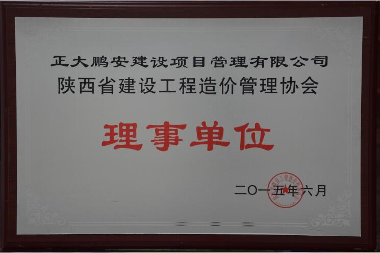2015年6月,經(jīng)陜西省建設(shè)工程造價(jià)管理協(xié)會(huì)專家委員會(huì)評(píng)審,正大鵬安建設(shè)項(xiàng)目管理有限公司榮獲“陜西省建設(shè)工程造價(jià)管理協(xié)會(huì)理事單位”。