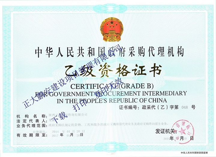 2014年1月公司取得中華人民共和國政府采購代理機構乙級資格證書。