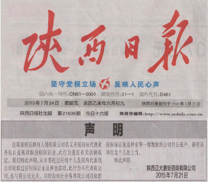 2015年7月21日,我公司在《陜西日報》上刊登聲明的截圖。