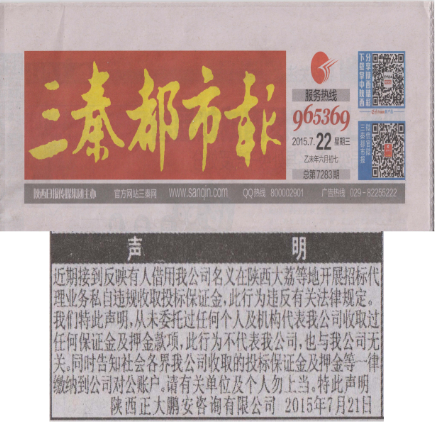 2015年7月21日,我公司在《三秦都市報》上刊登聲明的截圖。