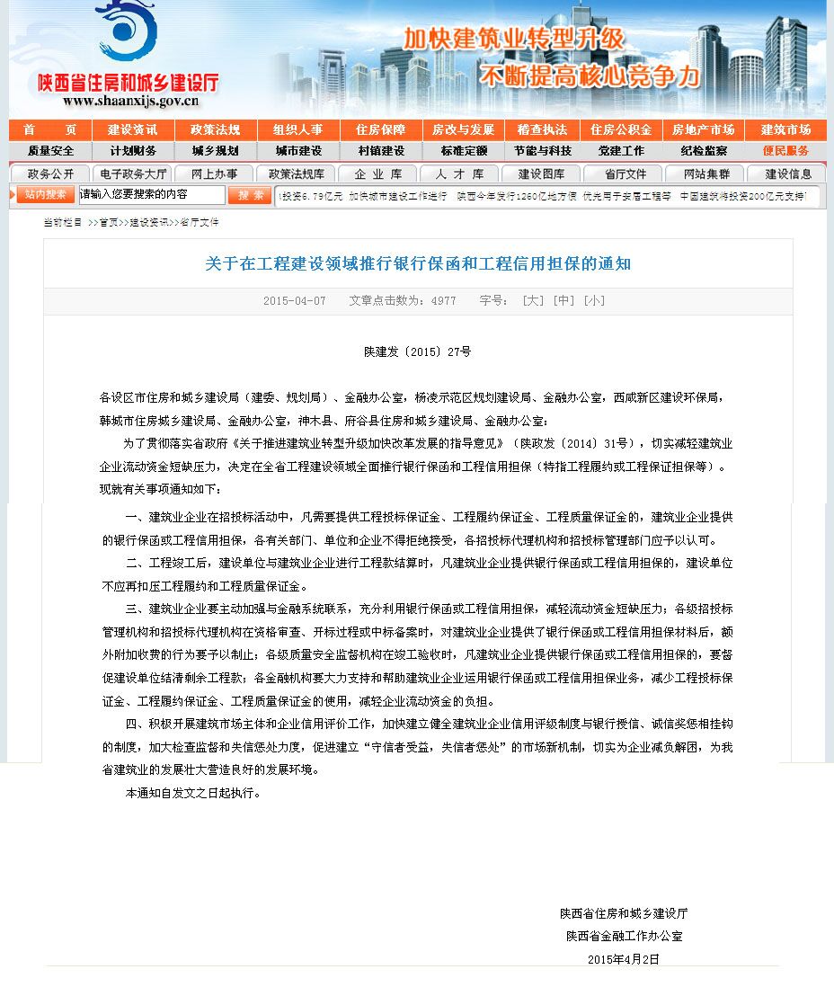 為了貫徹落實省政府《關于推進建筑業(yè)轉型升級加快改革發(fā)展的指導意見》(陜政發(fā)〔2014〕31號),切實減輕建筑業(yè)企業(yè)流動資金短缺壓力,決定在全省工程建設領域全面推行銀行保函和工程信用擔保(特指工程履約或工程保證擔保等)。現(xiàn)就有關事項通知如下: