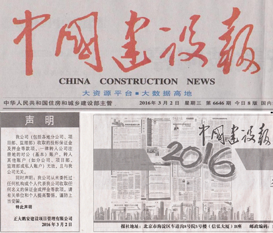 2016年3月2日,我公司在《中國建設(shè)報(bào)》上刊登聲明的截圖。