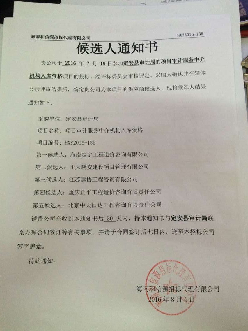 2016年7月19日,經(jīng)評標委員會綜合評審,招標人確認,正大鵬安建設(shè)項目管理有限公司入圍"定安縣審計局項目審計服務(wù)中介機構(gòu)入庫資格"。