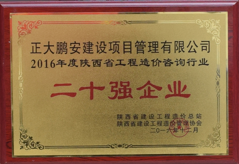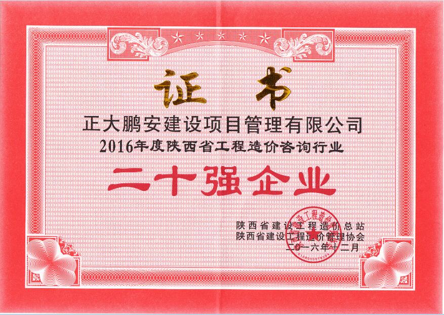 正大鵬安憑借企業(yè)誠信度好、市場占有率大、行業(yè)認(rèn)可度高,榮獲“2016年度陜西省工程造價咨詢行業(yè)二十強(qiáng)企業(yè)”。