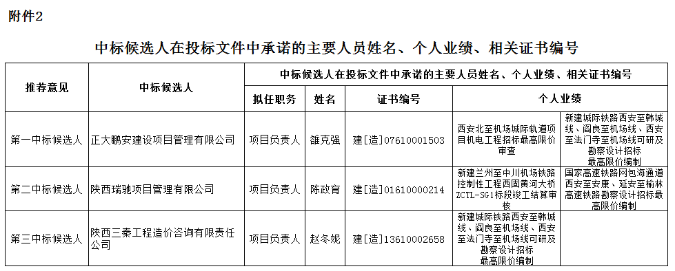 2.中標(biāo)候選人在投標(biāo)文件中承諾的主要人員姓名、個人業(yè)績、相關(guān)證書編號;