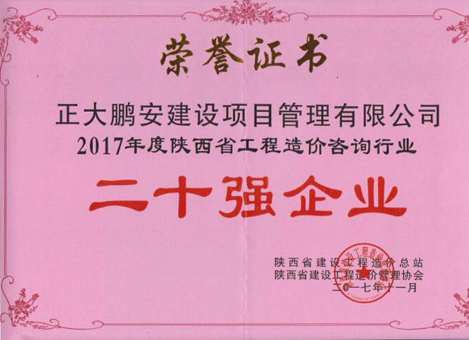 正大鵬安公司榮獲“2017年度陜西省工程造價(jià)咨詢行業(yè)20強(qiáng)企業(yè)”