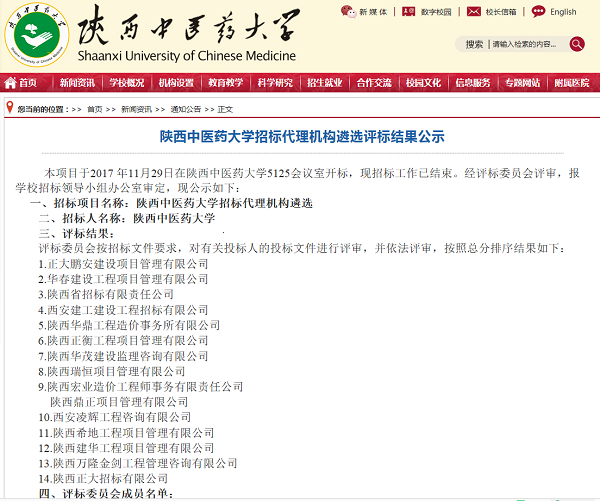2017年12月4日,我公司成功中標(biāo)陜西中醫(yī)藥大學(xué)招標(biāo)代理機(jī)構(gòu)遴選項(xiàng)目。