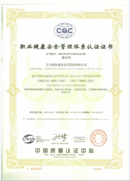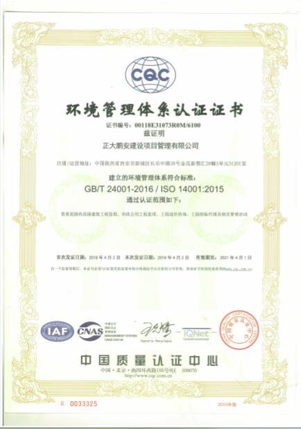 日前,正大鵬安公司申報(bào)的ISO9001:2015質(zhì)量管理體系認(rèn)證、ISO14001:2015環(huán)境管理體系認(rèn)證和OHSAS18001:2007職業(yè)健康安全管理體系認(rèn)證經(jīng)中國質(zhì)量認(rèn)證中心審定,獲準(zhǔn)通過并頒發(fā)了認(rèn)證證書。
