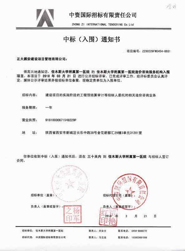 正大鵬安中標(biāo)佳木斯大學(xué)附屬第一醫(yī)院造價(jià)咨詢服務(wù)項(xiàng)目