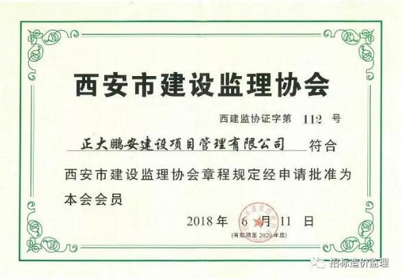 正大鵬安建設(shè)項(xiàng)目管理有限公司被批準(zhǔn)為西安市建設(shè)監(jiān)理協(xié)會(huì)會(huì)員,并頒發(fā)了會(huì)員單位證書。