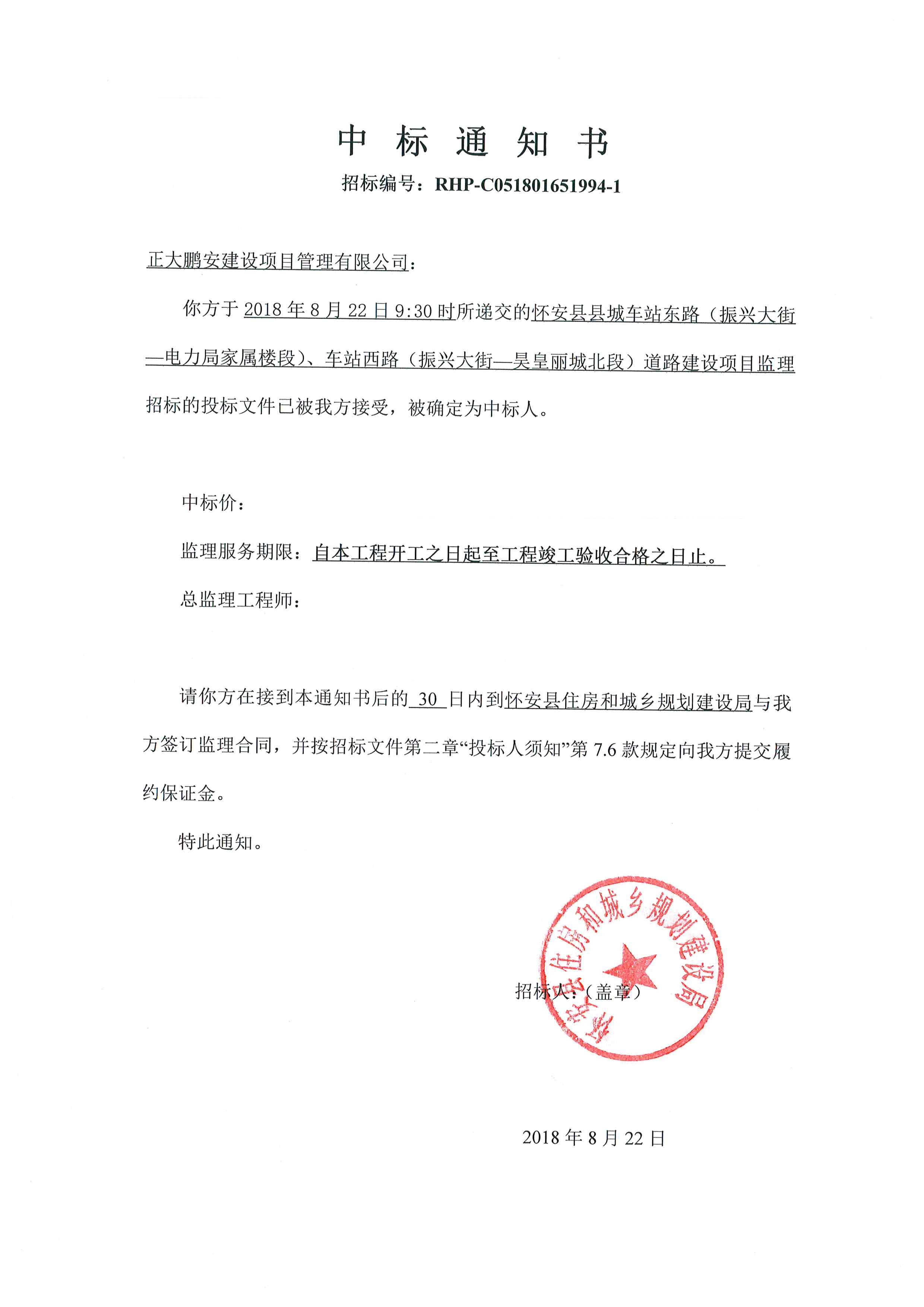 2018年8月22日,經(jīng)評標(biāo)委員會綜合評審,招標(biāo)人確認(rèn),正大鵬安中標(biāo)懷安縣縣城車站東路、西路工程監(jiān)理。