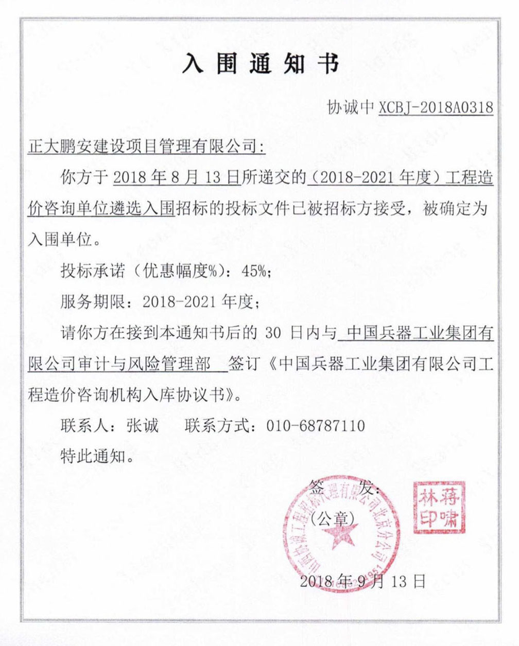 正大鵬安公司成功入圍中國兵器工業(yè)集團(2018—2021年度)工程造價咨詢單位遴選項目