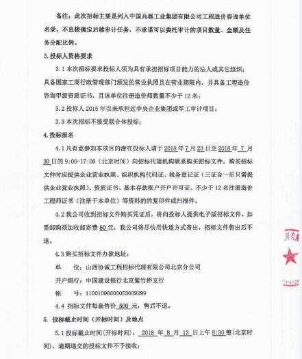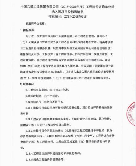 2018年8月13日,中國兵器工業(yè)集團就(2018—2021年度)工程造價咨詢單位遴選入圍項目進(jìn)行了公開招標(biāo)。