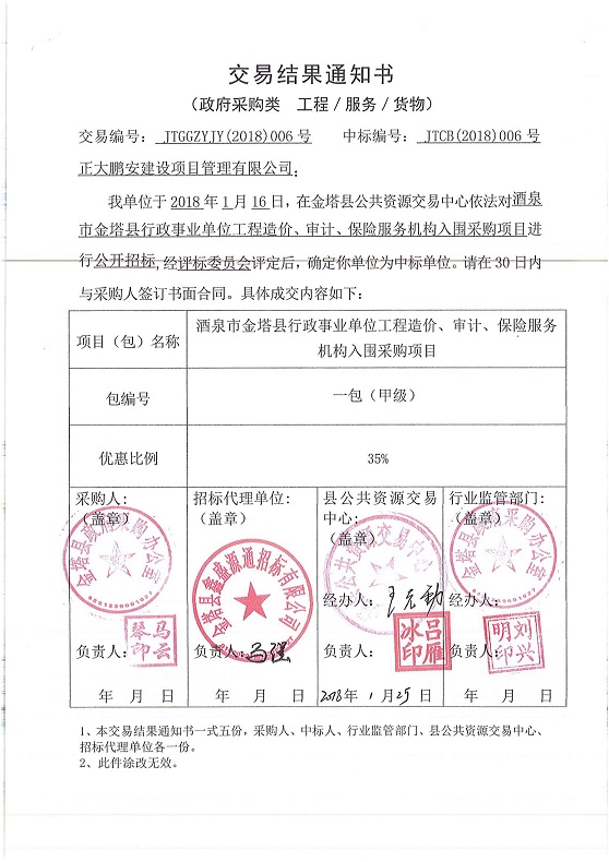 2018年1月16日,經(jīng)評標(biāo)委員會綜合評審,招標(biāo)人確認(rèn),正大鵬安建設(shè)項目管理有限公司中標(biāo)“酒泉市金塔縣行政事業(yè)單位工程造價、審計、保險服務(wù)機構(gòu)入圍采購項目”。