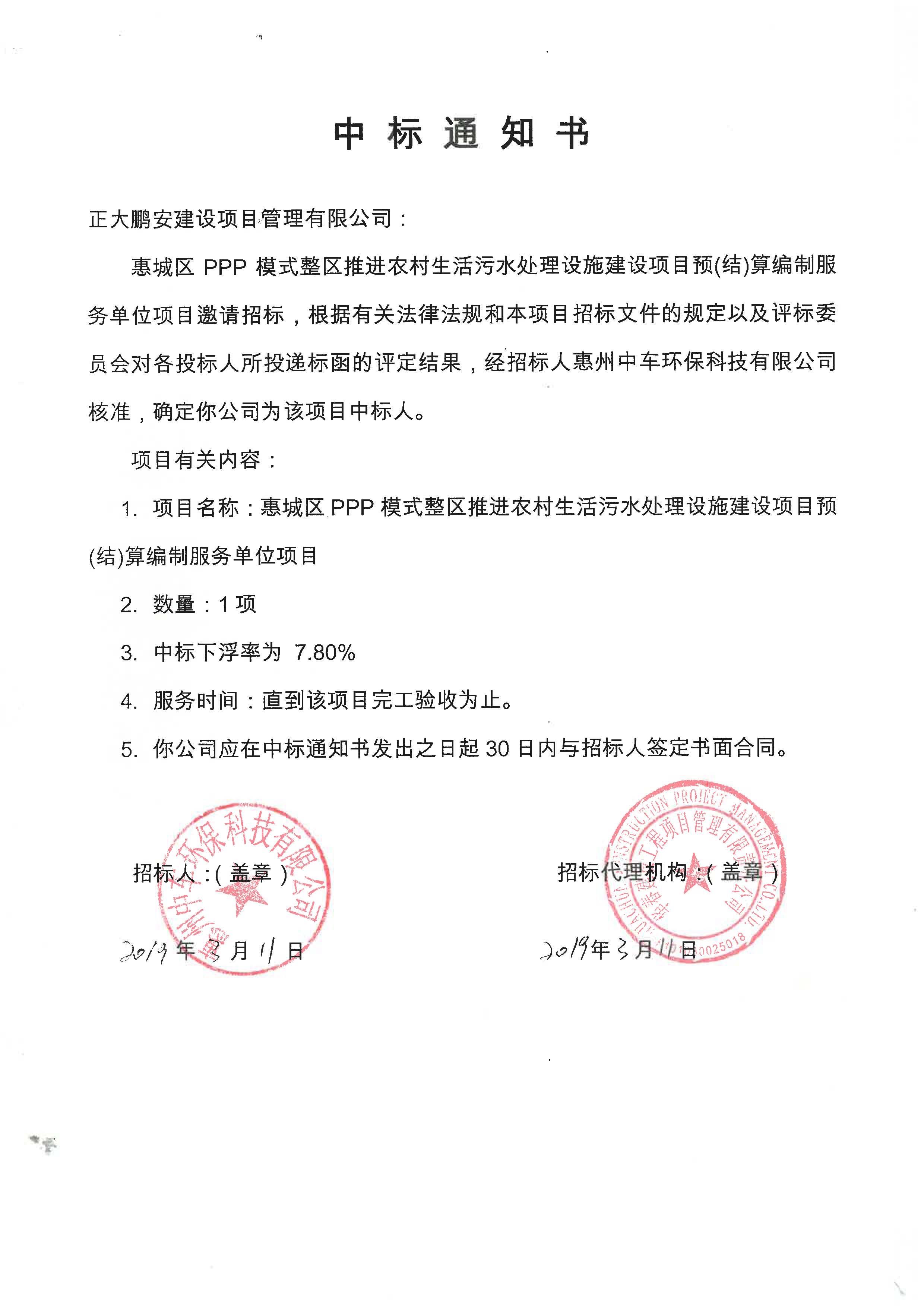2019年3月,經(jīng)評標(biāo)委員會評定,招標(biāo)人確認(rèn),正大鵬安建設(shè)項(xiàng)目管理有限公司中標(biāo)惠城區(qū)PPP模式整區(qū)推進(jìn)農(nóng)村生活污水處理設(shè)施建設(shè)項(xiàng)目預(yù)(結(jié))算編制服務(wù)單位項(xiàng)目的中標(biāo)人。