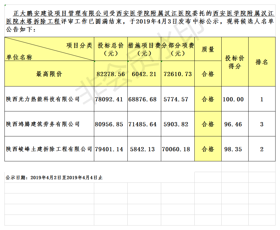 西安醫(yī)學(xué)院附屬漢江醫(yī)院水塔拆除工程中標(biāo)公示