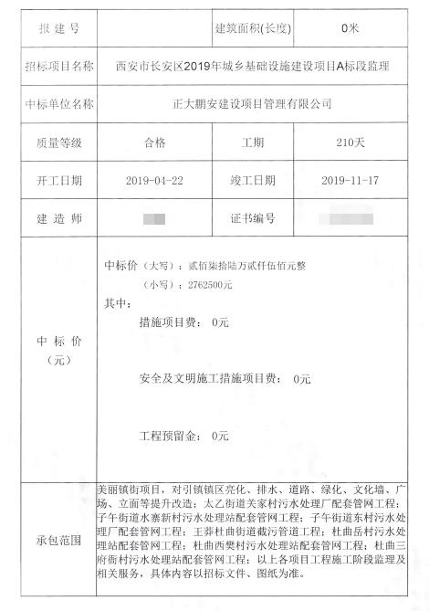 正大鵬安中標(biāo)西安市長安區(qū)2019年城鄉(xiāng)基礎(chǔ)設(shè)施建設(shè)項(xiàng)目A標(biāo)段監(jiān)理項(xiàng)目
