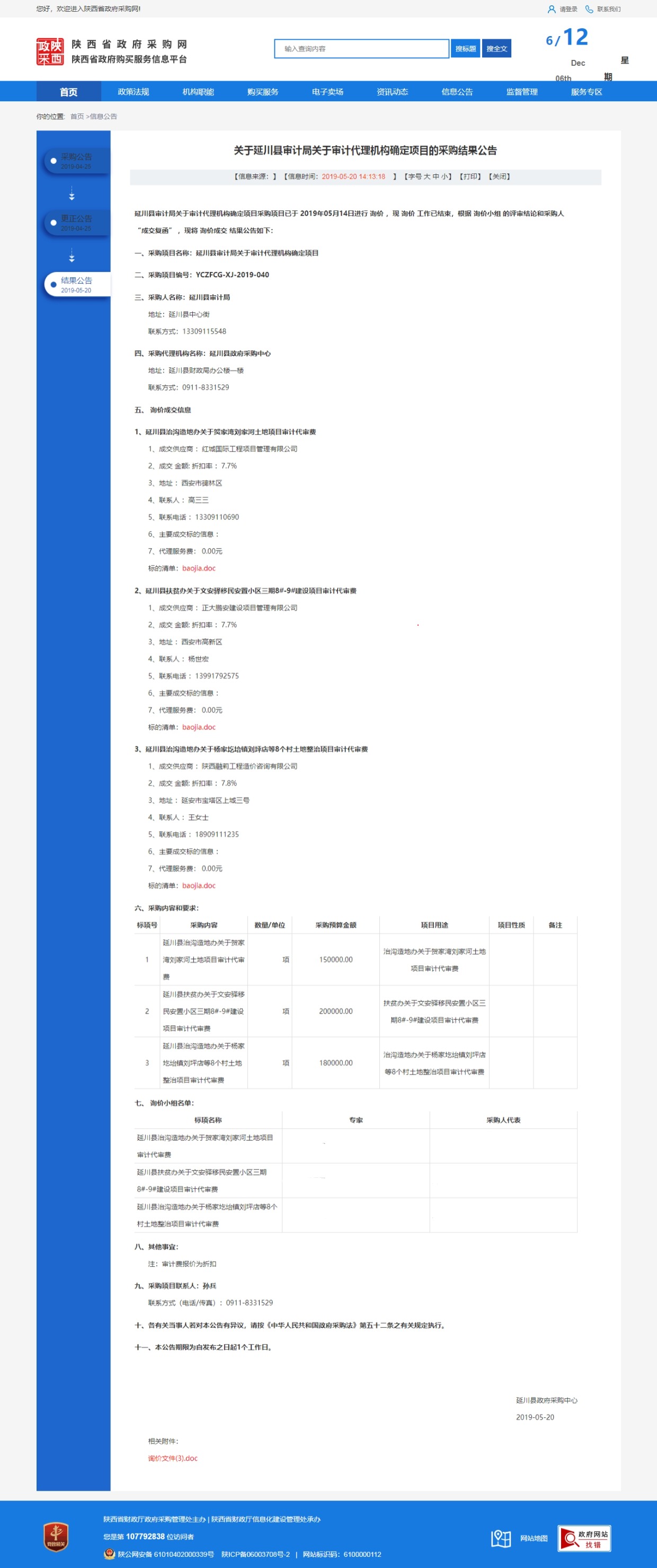 2019年5月14日,經評標委員會綜合評審,招標人確認,正大鵬安建設項目管理有限公司中標延川縣審計局關于審計代理機構確定項目。