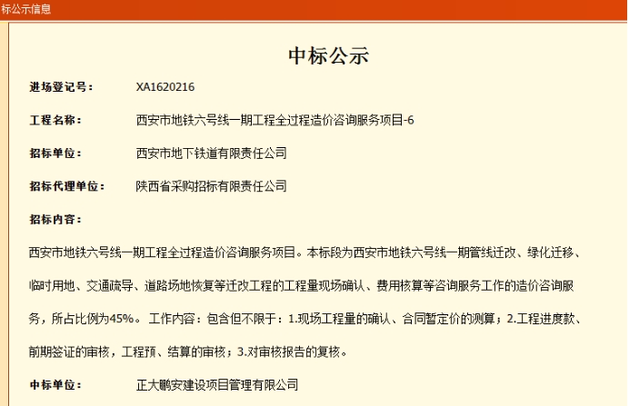 西安市地鐵六號線一期工程全過程造價咨詢服務(wù)項目D6QGCZJZX-6標(biāo)段