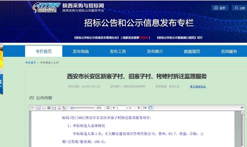 2019年11月,經(jīng)評(píng)標(biāo)委員會(huì)審定,招標(biāo)人確認(rèn),正大鵬安建設(shè)項(xiàng)目管理有限公司中標(biāo)。西安市長(zhǎng)安區(qū)新寨子村、舊寨子村、栳栳村拆遷監(jiān)理服務(wù)。