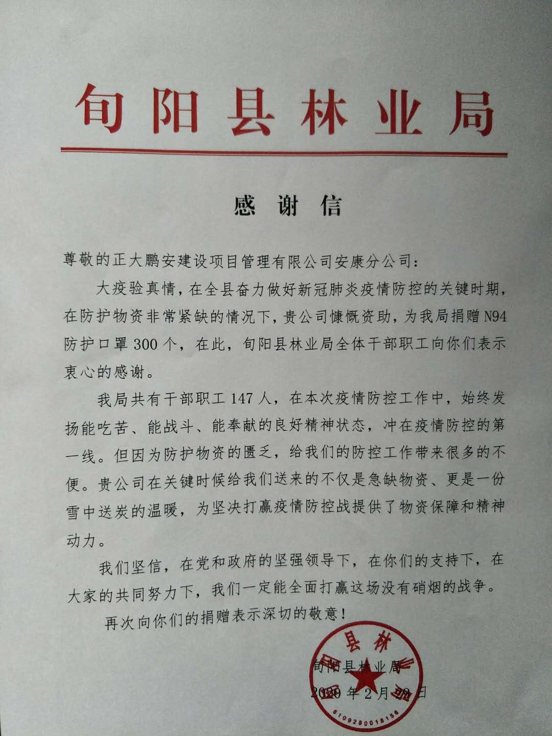 2月29日,一封來自旬陽縣林業(yè)局的感謝信送到了正大鵬安公司安康分公司。
