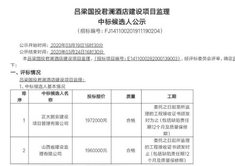 呂梁國投集團有限公司委托第三方,就“呂梁國投君瀾酒店建設項目監(jiān)理進行了公開招標,經(jīng)評標委員會審定,招標人確認,確定正大鵬安公司成功中標該項目監(jiān)理。