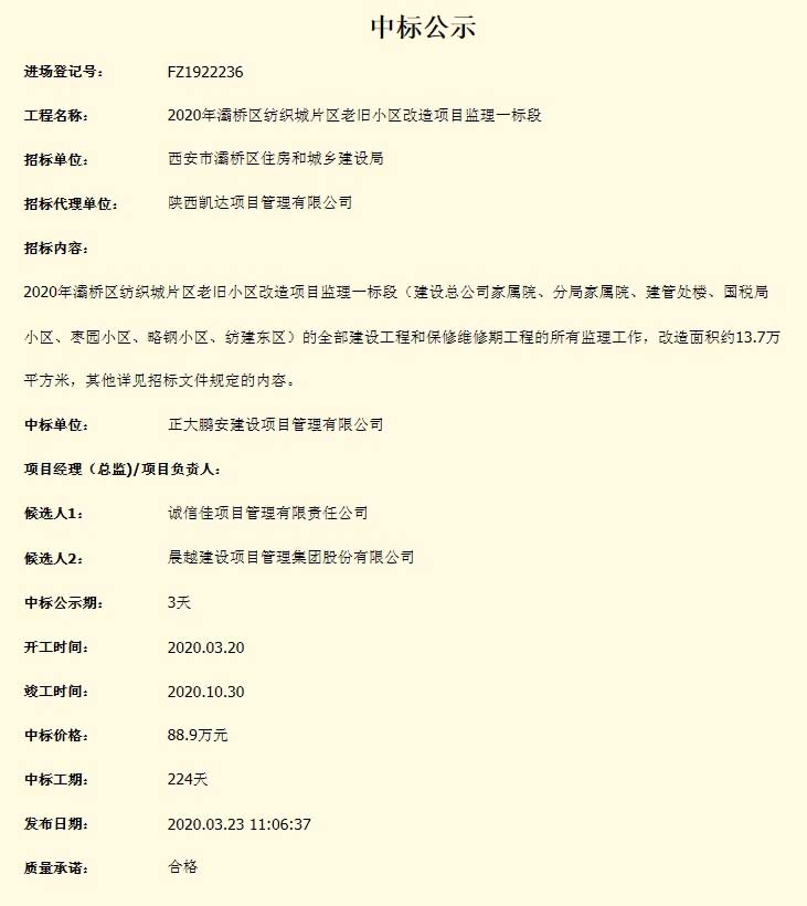 西安市灞橋區(qū)住房和城鄉(xiāng)建設局委托第三方,就“2020年灞橋區(qū)紡織城片區(qū)老舊小區(qū)改造項目監(jiān)理一標段”的全部建設工程和保修維修期工程的所有監(jiān)理工作進行了公開招標,經(jīng)評標委員會審定,招標人確認,確定正大鵬安公司中標該項目監(jiān)理。