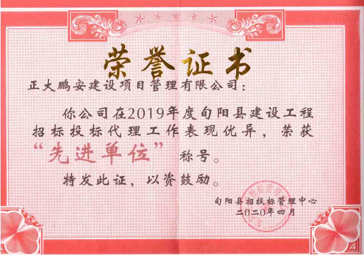正大鵬安公司榮獲2019年度旬陽縣建設(shè)工程招標投標代理工作先進單位