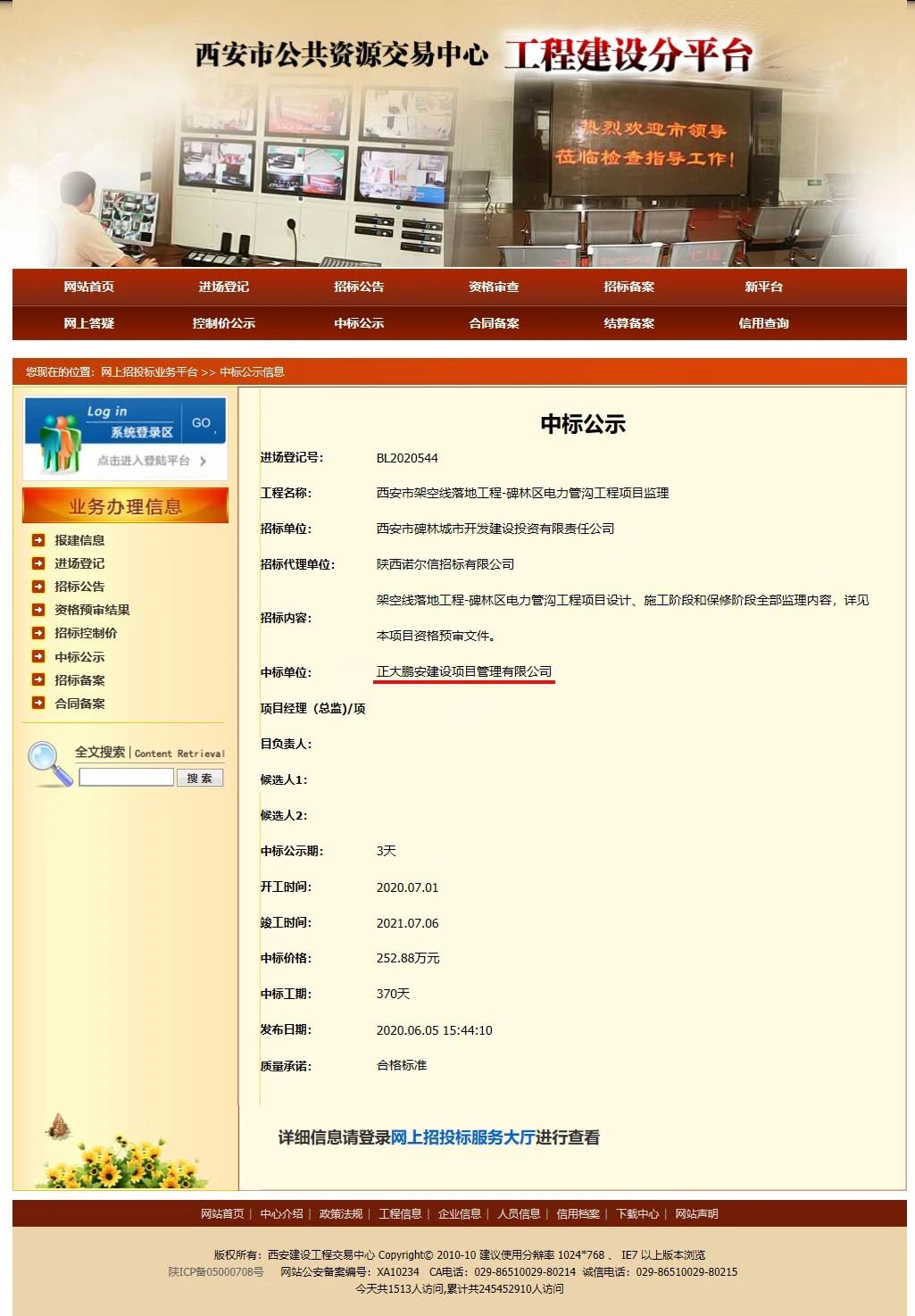 西安市碑林城市開發(fā)建設(shè)投資有限責任公司委托第三方,就“西安市架空線落地工程-碑林區(qū)電力管溝工程項目監(jiān)理 ” 進行了公開招標,經(jīng)評標委員會綜合評審,招標人確認,正大鵬安公司成功中標該項目。