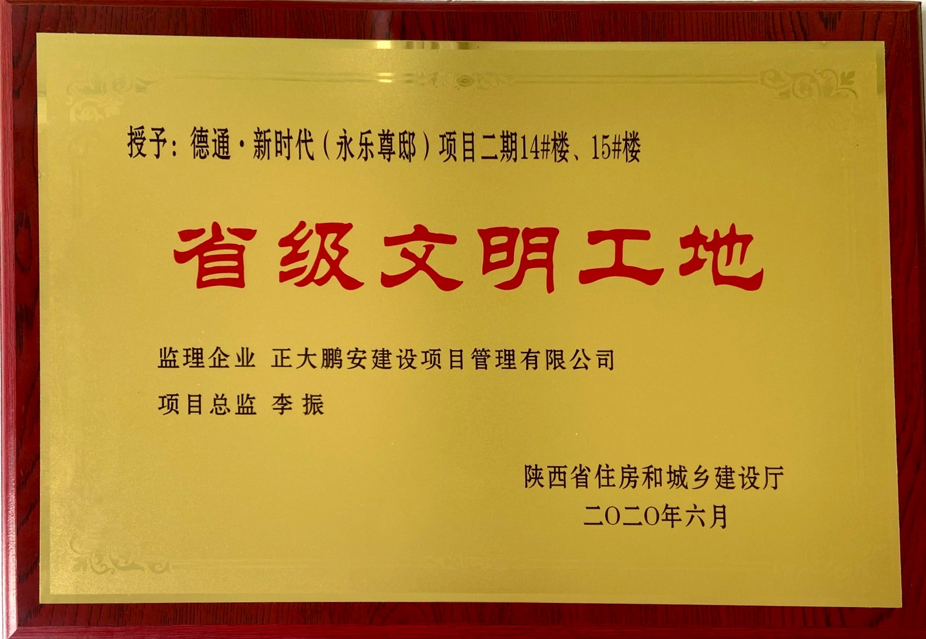 正大鵬安監(jiān)理的德通·新時(shí)代(永樂(lè)尊邸)項(xiàng)目二期14#樓、15#樓榮獲“省級(jí)文明工地”