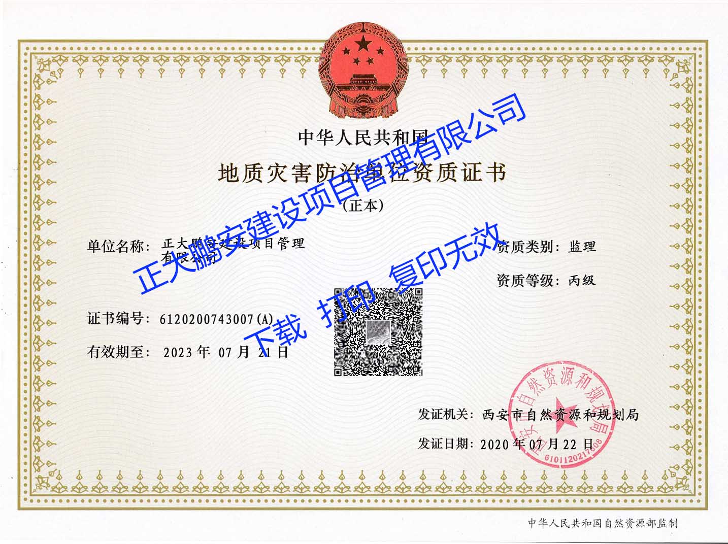 正大鵬安獲得地質(zhì)災害防治單位監(jiān)理丙級資質(zhì)