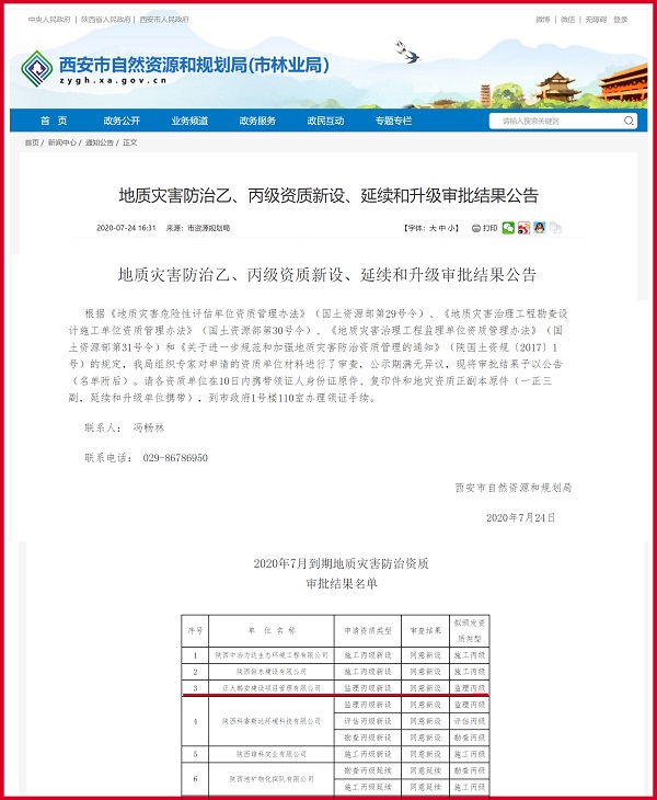 2020年7月24日西安市自然資源和規(guī)劃局發(fā)布《地質(zhì)災(zāi)害防治乙、丙級(jí)資質(zhì)新設(shè)、延續(xù)和升級(jí)審批結(jié)果公告》,正大鵬安公司地質(zhì)災(zāi)害防治單位監(jiān)理丙級(jí)資質(zhì)獲得批準(zhǔn)。