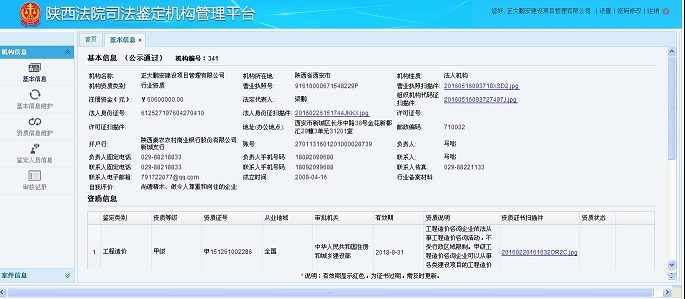 正大鵬安建設(shè)項目管理有限公司通過陜西法院司法鑒定機(jī)構(gòu)管理平臺網(wǎng)上登記