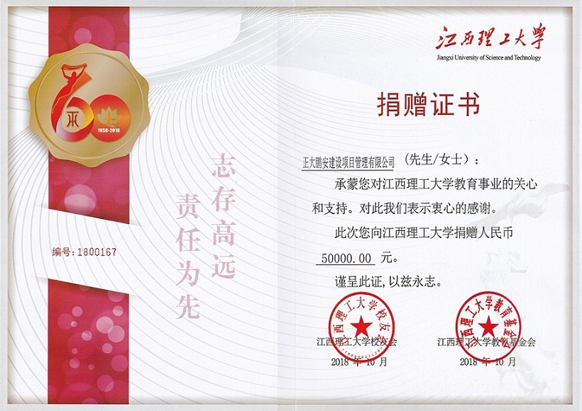 2018年10月正大鵬安建設項目管理有限公司向院校教育基金捐款