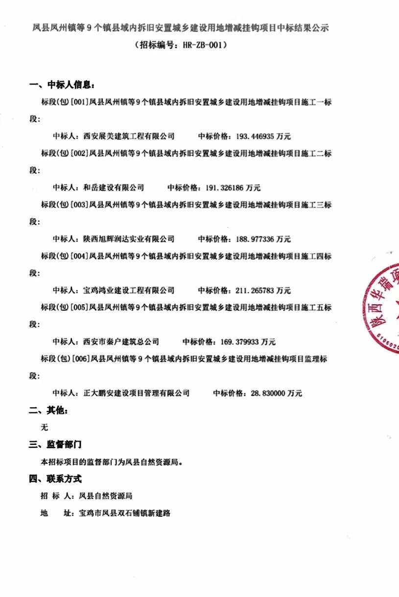 2020年9月,經(jīng)評(píng)標(biāo)委員會(huì)評(píng)定,招標(biāo)人確認(rèn),正大鵬安建設(shè)項(xiàng)目管理有限公司中標(biāo)寶雞市鳳縣自然資源局的“寶雞市鳳縣鳳州鎮(zhèn)等9個(gè)鎮(zhèn)縣域內(nèi)拆舊安置城鄉(xiāng)建設(shè)用地增減掛鉤項(xiàng)目監(jiān)理標(biāo)段項(xiàng)目”。