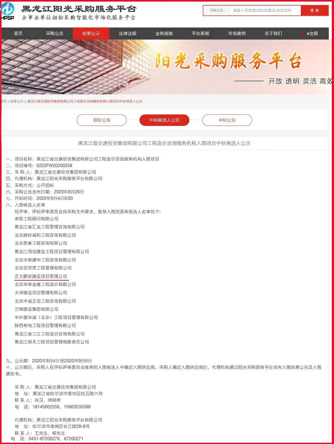 9月4日,黑龍江省交通投資集團(tuán)有限公司委托第三方就“黑龍江省交通投資集團(tuán)有限公司工程造價(jià)咨詢服務(wù)機(jī)構(gòu)入圍項(xiàng)目(項(xiàng)目編號:0222FW20200258)”進(jìn)行公開招標(biāo),經(jīng)評標(biāo)委員會綜合評審,采購人確認(rèn),正大鵬安公司入圍該項(xiàng)目。