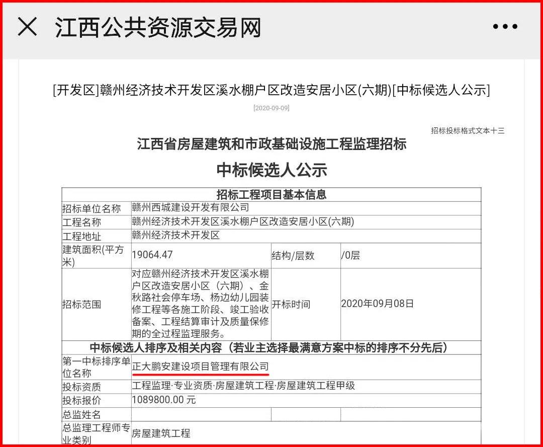 贛州經(jīng)濟技術開發(fā)區(qū)溪水棚戶區(qū)改造安居小區(qū)(六期)工程監(jiān)理項目進行公開招標,經(jīng)評標委員會綜合評審,采購人確認,正大鵬安公司中標該項目。