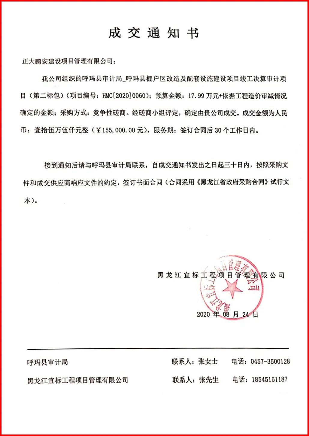 黑龍江呼瑪縣審計(jì)局委托第三方,就“呼瑪縣審計(jì)局-呼瑪縣棚戶區(qū)改造及配套設(shè)施建設(shè)項(xiàng)目竣工決算審計(jì)項(xiàng)目(第二標(biāo)包)(項(xiàng)目編號(hào):HMC[2020]0060)”進(jìn)行競(jìng)爭(zhēng)性磋商采購,經(jīng)磋商小組評(píng)定,招標(biāo)人確認(rèn),正大鵬安公司中標(biāo)該項(xiàng)目。