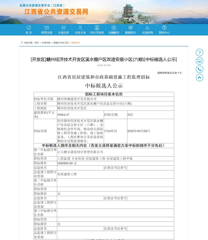 正大鵬安中標(biāo)江西省贛州經(jīng)濟(jì)技術(shù)開(kāi)發(fā)區(qū)溪水棚戶(hù)區(qū)改造安居小區(qū)(六期)工程監(jiān)理