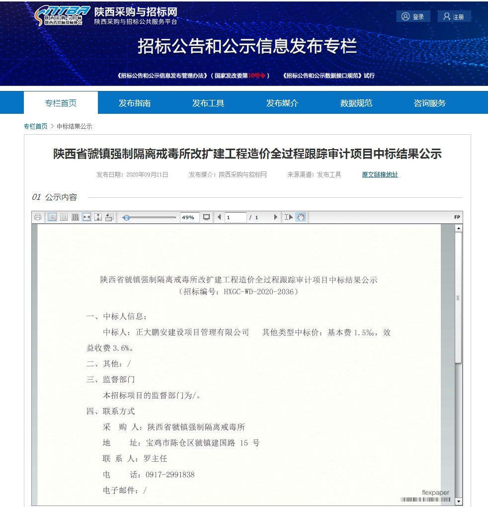 2020年9月,陜西省虢鎮(zhèn)強(qiáng)制隔離戒毒所委托第三方,就“陜西省虢鎮(zhèn)強(qiáng)制隔離戒毒所改擴(kuò)建工程造價(jià)全過(guò)程跟蹤審計(jì)項(xiàng)目”進(jìn)行公開(kāi)招標(biāo),經(jīng)評(píng)標(biāo)委員會(huì)綜合評(píng)審,招標(biāo)人確認(rèn),正大鵬安公司中標(biāo)該全過(guò)程項(xiàng)目。