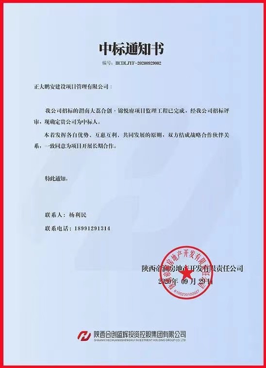 2020年9月,經(jīng)評標委員會評定,招標人確認,正大鵬安建設項目管理有限公司中標陜西帝瀾房地產(chǎn)開發(fā)有限責任公司的“渭南大荔合創(chuàng)•錦悅府監(jiān)理”項目。