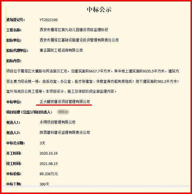 2020年10月,經(jīng)評(píng)標(biāo)委員會(huì)評(píng)定,招標(biāo)人確認(rèn),正大鵬安建設(shè)項(xiàng)目管理有限公司中標(biāo)西安市雁塔區(qū)基礎(chǔ)設(shè)施建設(shè)投資管理有限責(zé)任公司的“西安市雁塔區(qū)第九幼兒園建設(shè)項(xiàng)目監(jiān)理標(biāo)段”項(xiàng)目。