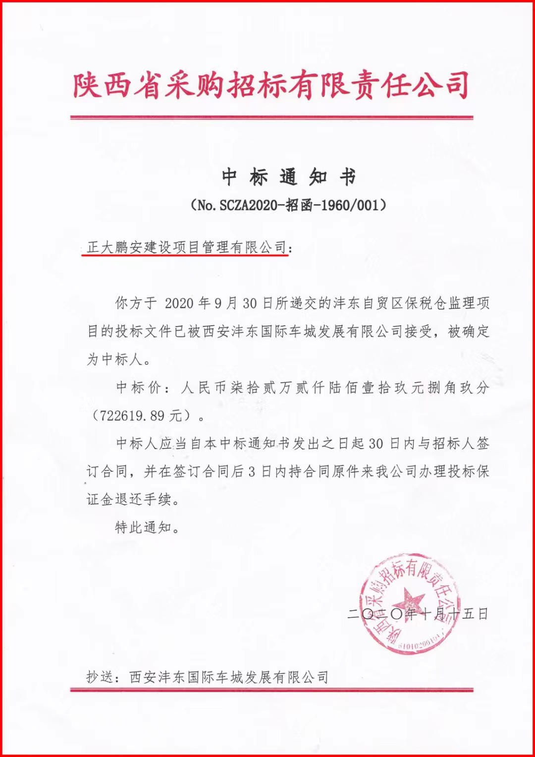 2020年9月,經(jīng)評(píng)標(biāo)委員會(huì)評(píng)定,招標(biāo)人確認(rèn),正大鵬安建設(shè)項(xiàng)目管理有限公司中標(biāo)西安灃東國(guó)際車城發(fā)展有限公司的“灃東自貿(mào)區(qū)保稅倉(cāng)監(jiān)理”項(xiàng)目。