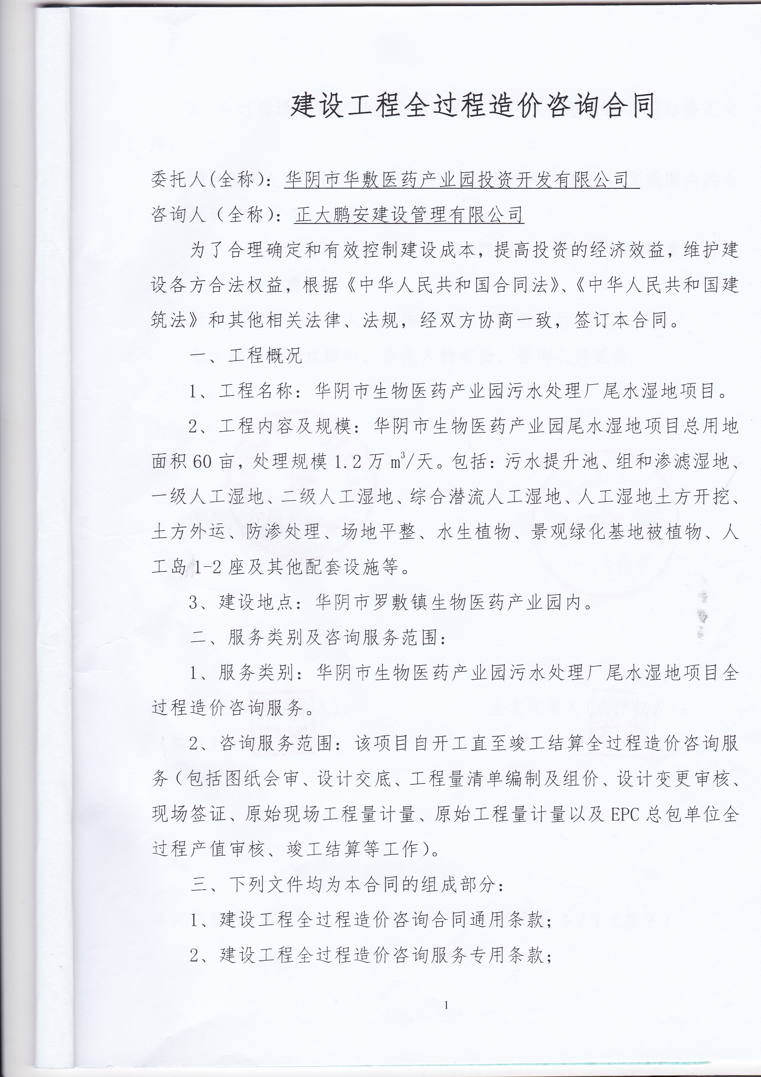 工程概況:華陰市生物醫(yī)藥產(chǎn)業(yè)園尾水濕地項(xiàng)目總用地面積60畝,處理規(guī)模1.2萬m3/天。包括:污水提升池、組和滲濾濕地、一級(jí)人工濕地、二級(jí)人工濕地、綜合潛流人工濕地、人工濕地土方開挖、土方外運(yùn)、防滲處理、場(chǎng)地平整、水生植物、景觀綠化基地被植物、人工島1-2座及其他配套設(shè)施等。正大鵬安建設(shè)項(xiàng)目管理有限公司負(fù)責(zé)本項(xiàng)目的結(jié)算審核工作。