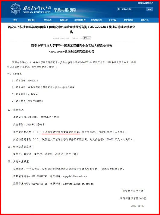 11月3日,我公司參與投標(biāo)西安電子科技大學(xué)半導(dǎo)體國(guó)家工程研究中心實(shí)驗(yàn)大樓造價(jià)咨詢項(xiàng)目,經(jīng)評(píng)審委員會(huì)綜合評(píng)審,招標(biāo)人確認(rèn),正大鵬安建設(shè)項(xiàng)目管理有限公司中標(biāo)。