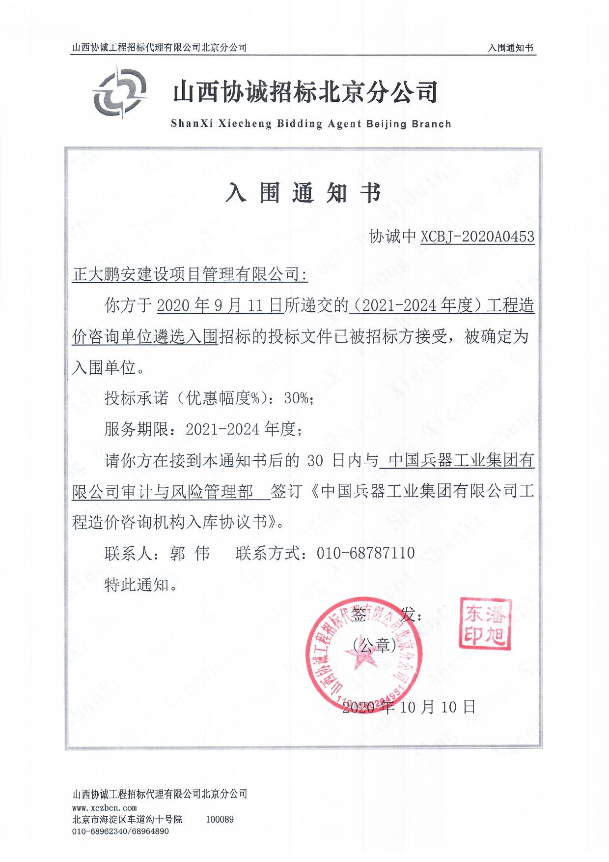 2020年9月,我公司參與“中國(guó)兵器工業(yè)集團(tuán)(2021-2024年度)工程造價(jià)咨詢單位遴選入圍”招標(biāo)項(xiàng)目,經(jīng)評(píng)審委員會(huì)綜合評(píng)審,招標(biāo)人確認(rèn),正大鵬安公司入圍該項(xiàng)目。服務(wù)期限:2021-2024年度。