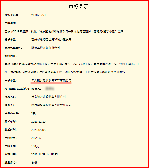 2020年11月24日,西安市雁塔區(qū)住房和城鄉(xiāng)建設(shè)局委托第三方就“西安市2019年度第一批城市維護建設(shè)前期準備項目-青龍北路西延伸(西延路-建聯(lián)小區(qū))監(jiān)理”項目進行公開招標,經(jīng)評審委員會綜合評審,招標人確認,正大鵬安建設(shè)項目管理有限公司中標。