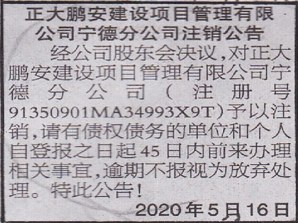 經(jīng)公司股東會(huì)決議,對(duì)正大鵬安建設(shè)項(xiàng)目管理有限公司寧德分公司(注冊(cè)號(hào)91350901MA34993X9T)予以注銷,請(qǐng)有債權(quán)債務(wù)的單位和個(gè)人自登報(bào)之日起45日內(nèi)前來辦理相關(guān)事宜,逾期不報(bào)視為放棄處理,特此公告。