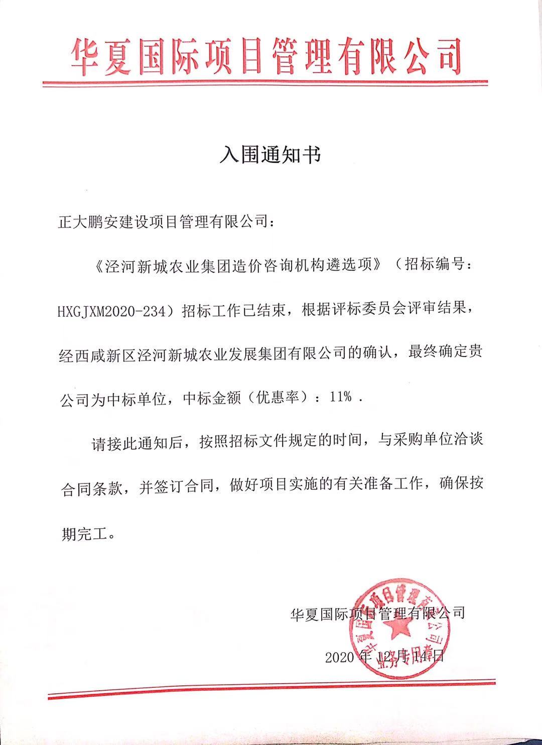 正大鵬安中標涇河新城農業(yè)集團造價咨詢機構遴選項目