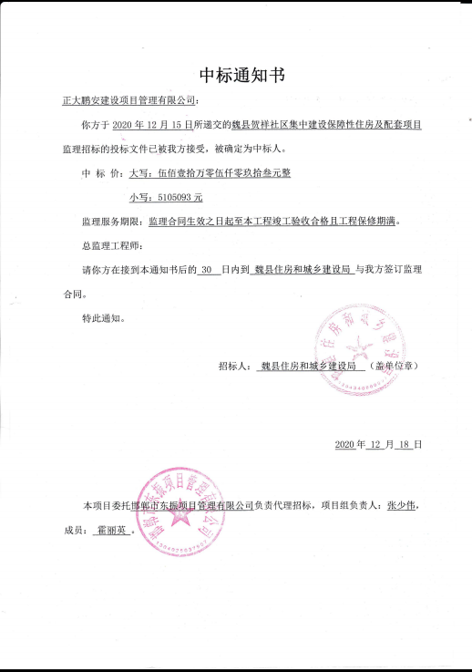 正大鵬安中標(biāo)魏縣賀祥社區(qū)集中建設(shè)保障性住房及配套項(xiàng)目監(jiān)理